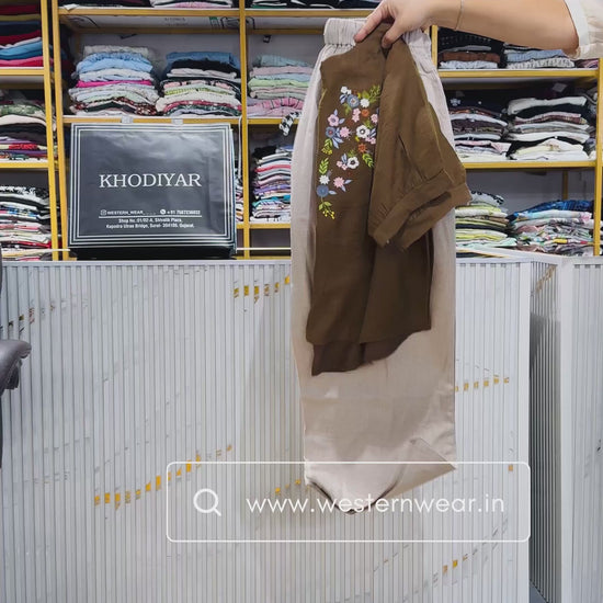 BROWN EMBROIDERY TOP WITH LINEN PANT SETTOP DETAIL:-