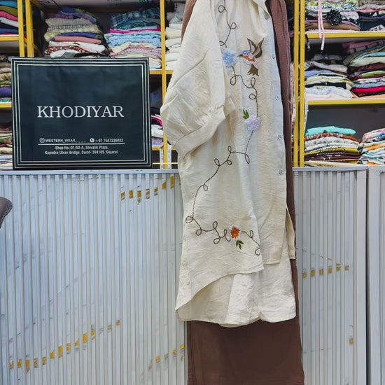 OFF WHITE BIRD EMBROIDERY A LINE LONG TUNIC TOP WITH LINEN PANT SET