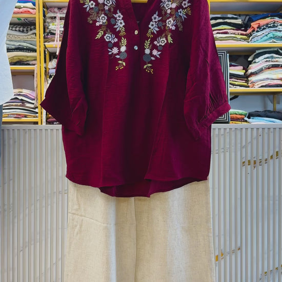 MAROON EMBROIDERY CASUAL TOP WITH LINEN PANT SET