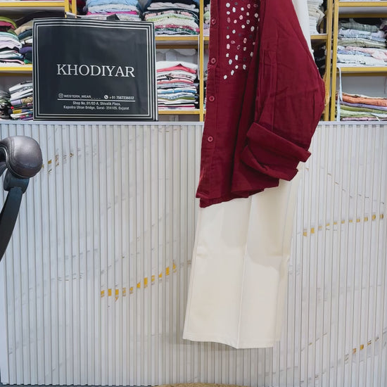 MAROON EMBROIDERY MUL COTTON SHIRT WITH BELL BOTTOM TROUSER PANT SET