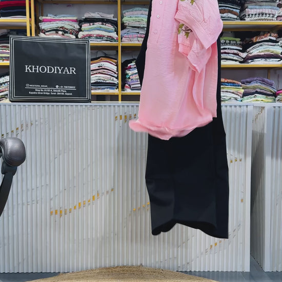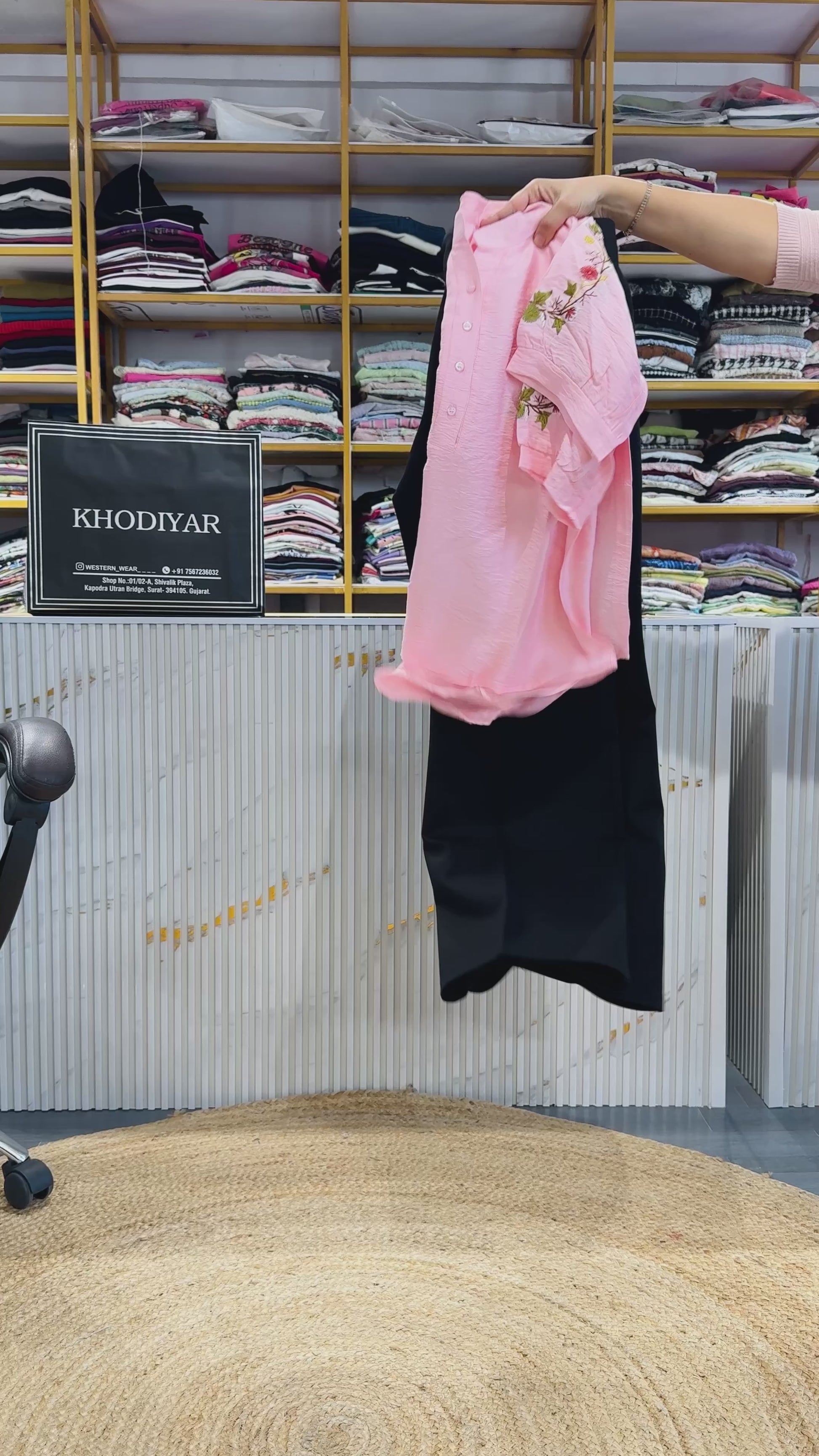 PEACH SLEEVE EMBROIDERY TOP WITH BELL BOTTOM BLACK TROUSER SET