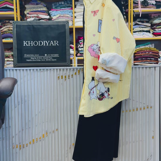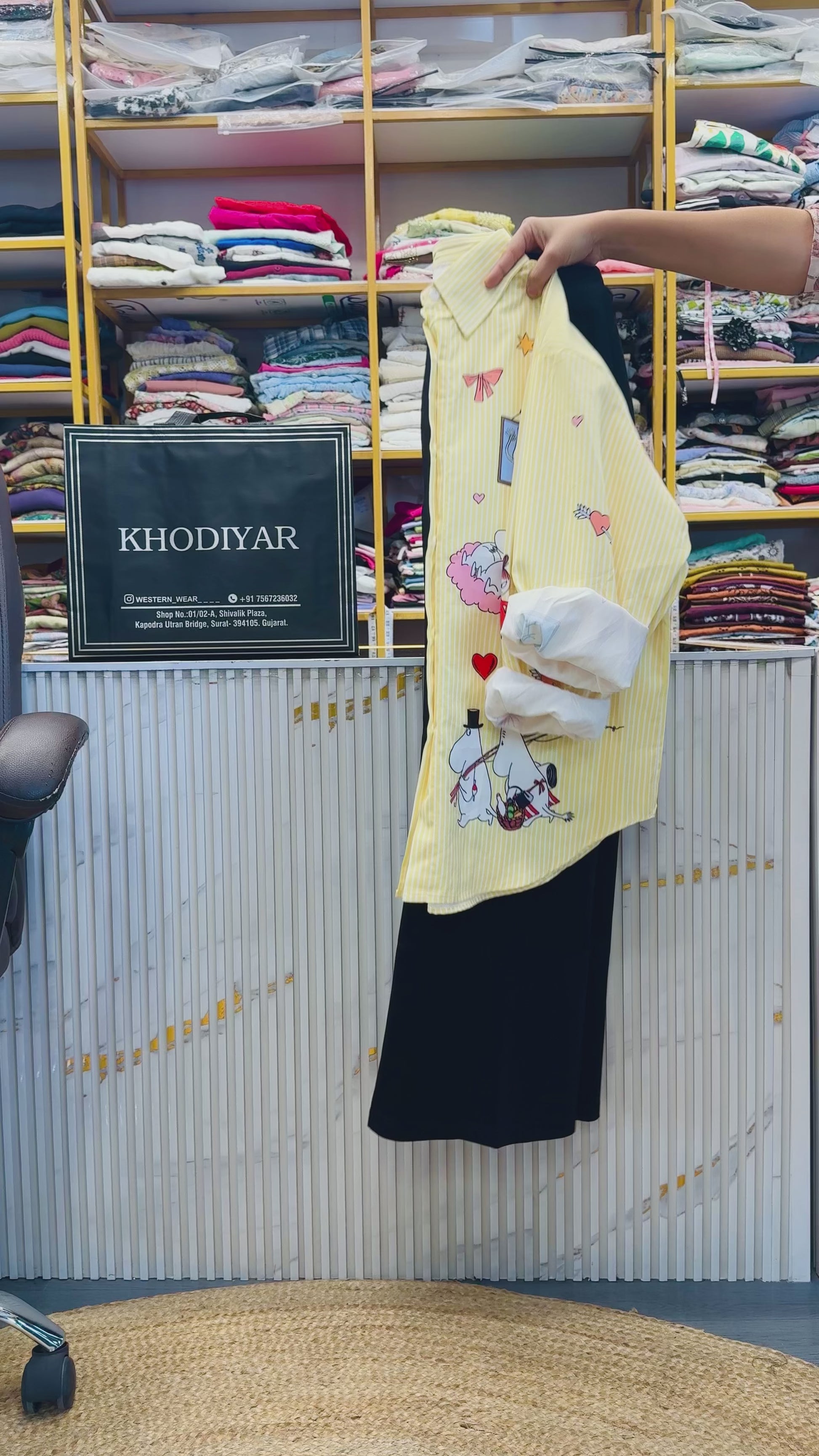 STRIPS CARTOON PRINT LONG SHIRT WITH BELL BOTTOM PANT SET