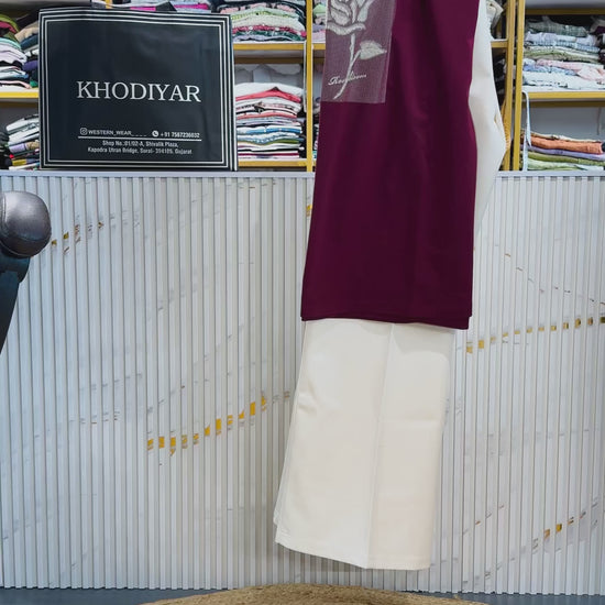 WINE MAROON ROSE EMBROIDERY TSHIRT WITH BELL BOTTOM TROUSER PANT SET